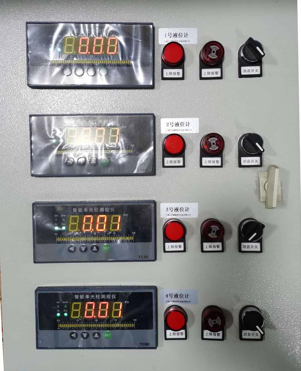 控制柜內部嵌入有多個液位變聲器控制主機,該主機能實時采集液位變送器的數(shù)據,并更加設定的報警閾值給出 上下限閾值聲光報警的功能